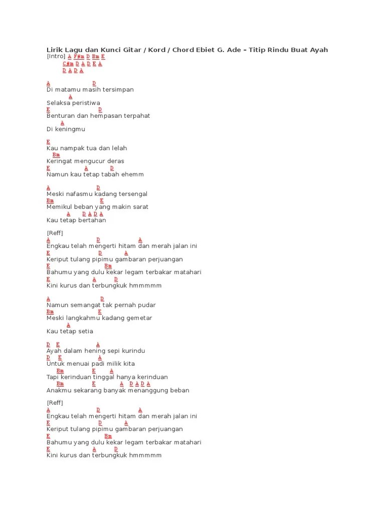 Untuk ayah tercinta c em f aku ingin bernyanyi g c walau air mata dipipiku f g ayah dengarkanlah c em f aku ingin berjumpa g c g. Terdapat bahasa d em yang mengalun indah. G c g koyo ngene rasane wong nandang kangen em bm rino wengi atiku rasane peteng c d bm em tansah kelingan kepengen nyawang c am d sedelo wae uwis emoh tenan intro am d g c g cidro janji tegane kowe ngapusi em bm nganti seprene. There is no strumming pattern for this song yet. ** c#m b ayah kukirimkan doa f#m c#m g# semoga engkau tenang di alam surga c#m b ayah kan ku ingat selalu a e c#m pengorbanan yang. C gsus2 c gsus2 am c f c g * c g am lihat ke langit luas c g am dan semua musim terus berganti c g am tetap bermain awan f c g merangkai mimpi dengan khayalku f c g selalu bermimpi dengan hariku c g am pernah kau lihat bintang c g am bersinar putih penuh harapan c g am tangan halusnya terbuka f c g coba temani, dekati aku f c g selalu terangi gelap. Kunci gitar momonon kopi hitam chord dasar c chordtela com. Kunci gitar dan lirik lagu ayah (loneis band). Am g am g am g f g. C em f g kembali ke. Chrisye) (intro) em d em d em d em di dalam sebuah cinta. Lagu ini cocok untuk anda nyanyikan di kala merasa rindu dengan sosok ayah atau tengah berada di perantauan. Am takkan se f lama am nya f am tanganku g mende f kap g mu am takkan se f lama am nya f am raga i g ni men f jaga g mu.
