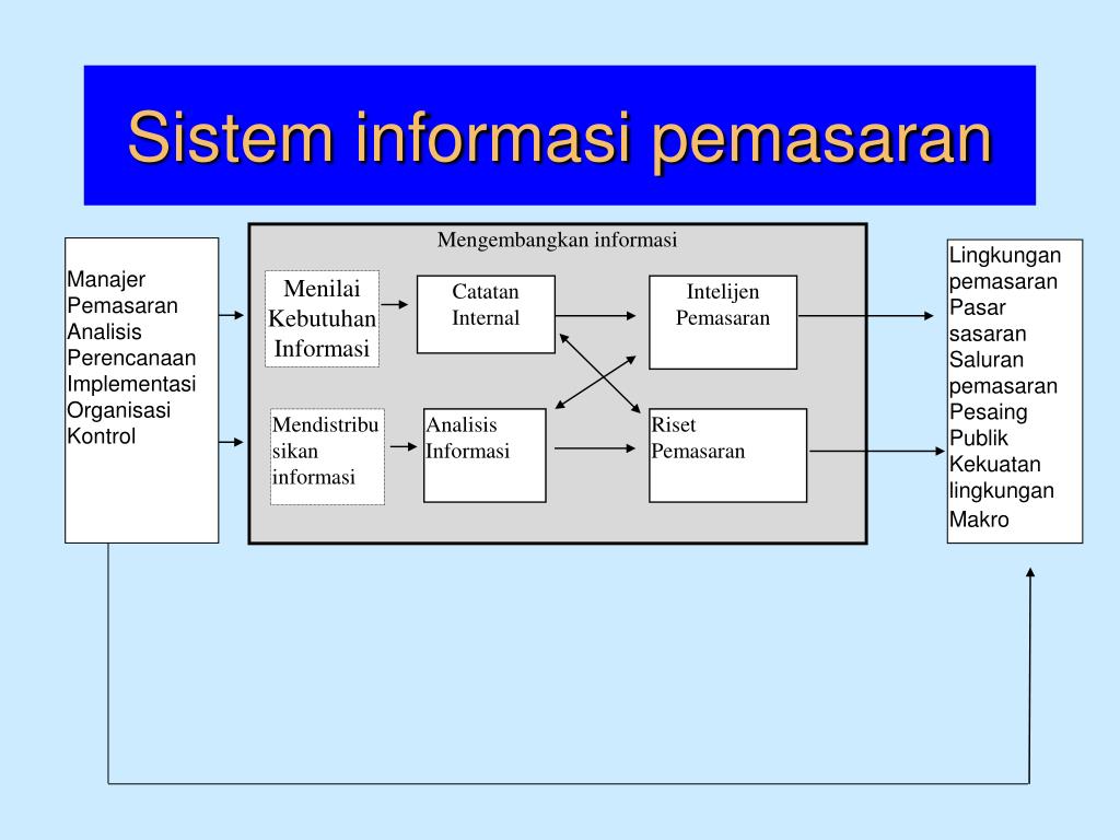 Yang didapat dari promotion subsystem berupa data terdiri dari catatan internal, intelegen pemasaran,. Beberapa perusahaan telah mengembangkan system informasi pemasaran yang dapat. Informasi yang dibutuhkan dihasilkan melalui catatan internal perusahaan, kegiatan intelijen perusahaan, riset pemasaran dan analisis pendukung . Siapa saja yang di libatkan dalam sistem intelejen pemasaran ? Contoh riset pemasaran sederhana, ada sebuah pabrik sepatu di sidoarjo yang berencana akan menaikan harga produk karena kenaikan harga bahan .